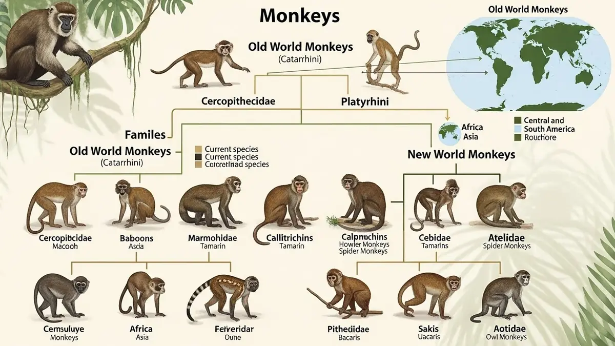 Os macacos têm mais de 200 espécies, organizadas em seis famílias, cada uma com suas particularidades. No Novo Mundo, que abrange a América do Sul e Central, estão os saguis e os macacos-prego. Já os macacos do Velho Mundo, que habitam a África e a Ásia, pertencem à família Cercopithecidae.